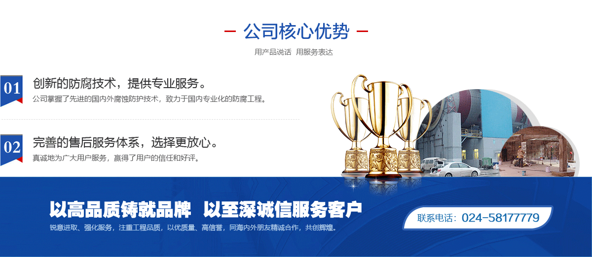 2004;GB/T28001-2011/OHSAS18001:2007;GB/T19001-2008/ISO9001:2008認(rèn)證 體系,取得了化工防腐蝕施工資質(zhì)等級(jí)一級(jí)單位,遼寧省腐蝕與防護(hù)學(xué)會(huì)防腐施工專業(yè)委員 會(huì)主任委員會(huì)主任委員單位,是中國(guó)石油撫順石油化工公司網(wǎng)內(nèi)成員單位。幾年來(lái)本著“客 戶為尊、精益求精”的服務(wù)宗旨,服務(wù)于基礎(chǔ)設(shè)施、石油、化工、治金、化纖、能源、礦山、 核電站、海洋工程等眾多行業(yè)企業(yè)。 ![]() ![]() ![]() ![]() |